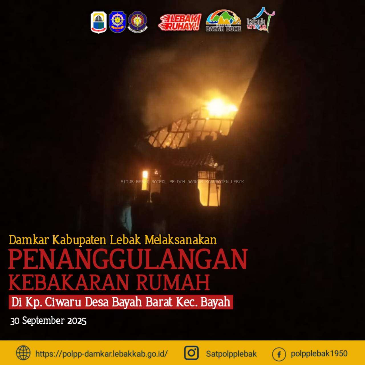 Selasa, 30 September 2025 pukul 00.02 WIB. Petugas Damkar manajemen wilayah kebakaran (WMK) sektor 5 Bayah menerima aduan kebakaran rumah seorang warga Kp. Ciwaru RT 03 RW 08 Desa Bayah Barat Kecamatan Bayah.